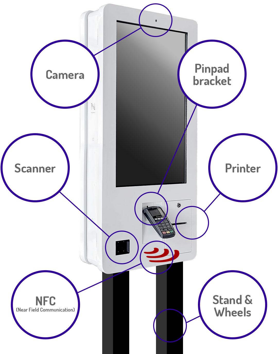 The 32” self-ordering kiosk has 6 different configurations enabling you to install it on a wall, fixed as a flag or as a standalone kiosk. Whatever the space you have, it will fit perfectly to your layout. Our self-service kiosks are available with an ordering screen on one or two sides.